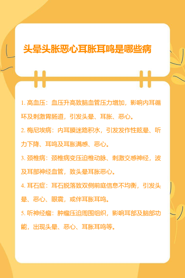 头晕头胀恶心耳胀耳鸣可能是高血压、梅尼埃病、颈椎病、耳石症、听神经瘤等疾病。
