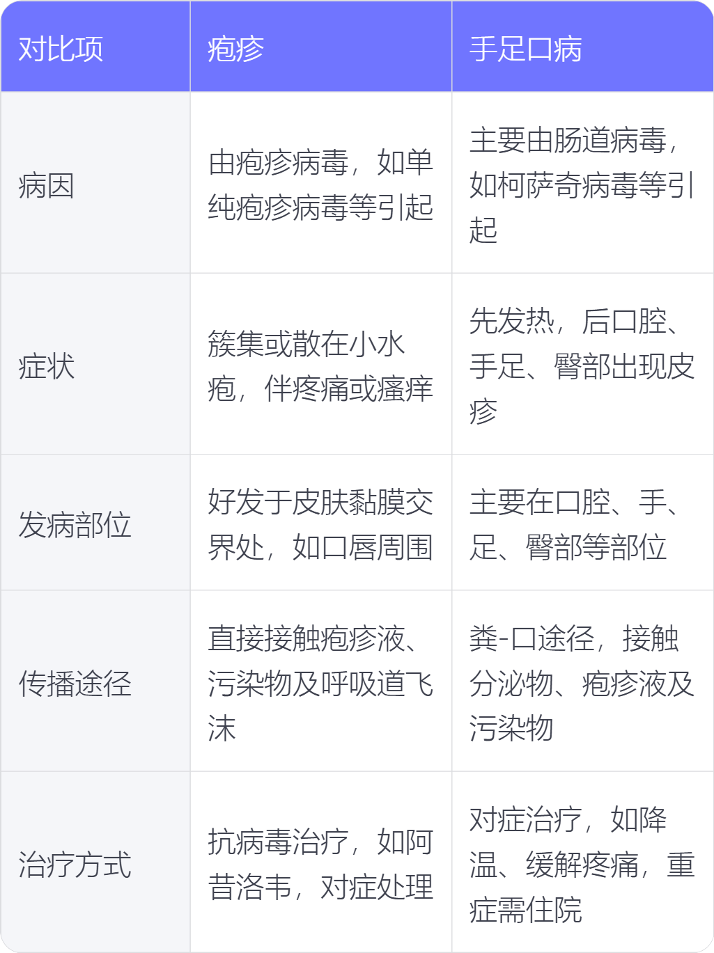 5. 治疗方式:疱疹治疗以抗病毒为主,如使用阿昔洛韦等药物,同时对症处理疼痛、瘙痒等症状;手足口病治疗主要是对症治疗,如降温、缓解口腔疼痛等,若病情严重可能需住院治疗。