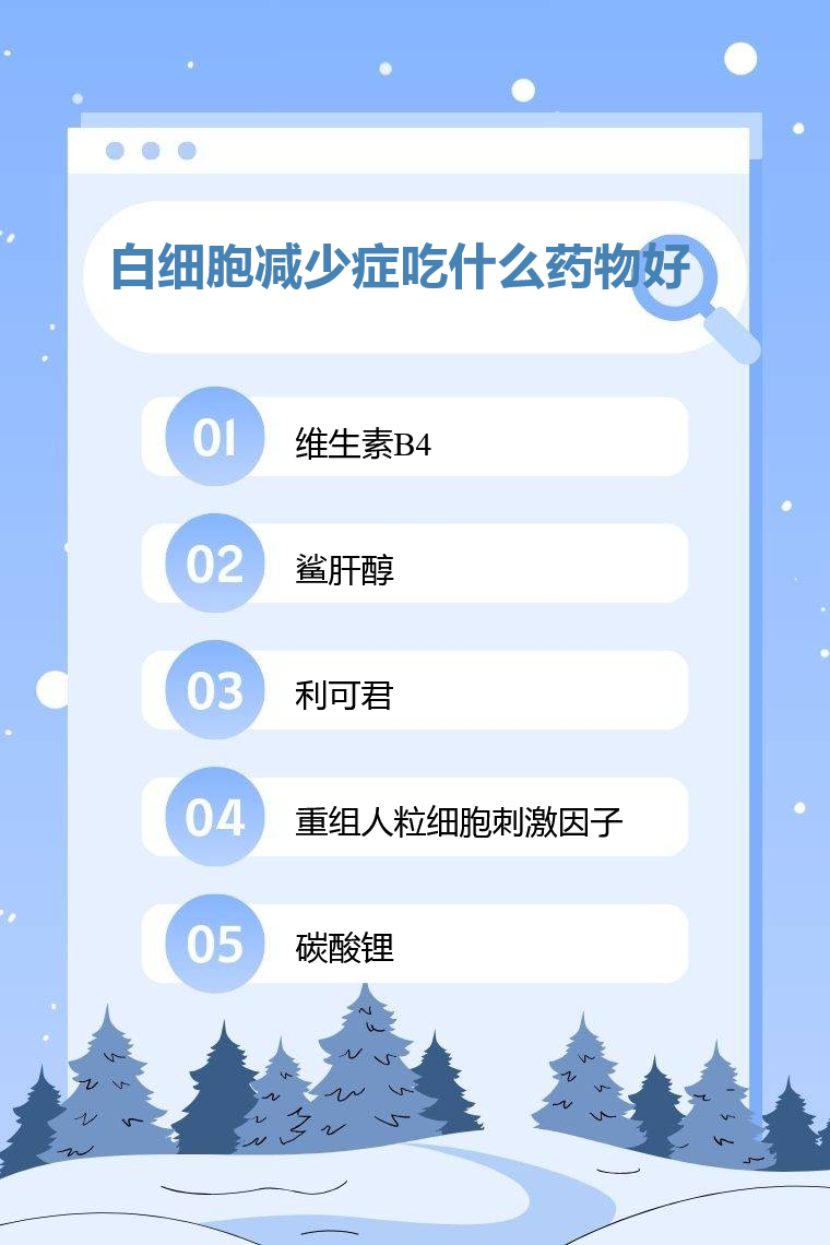 1.维生素B4:是一种促进白细胞增生的药物,它能够参与体内RNA和DNA的合成,有助于提高白细胞的数量。一般安全性较高,副作用相对较少,适合轻度白细胞减少症患者长期服用,可在一定程度上改善白细胞水平。