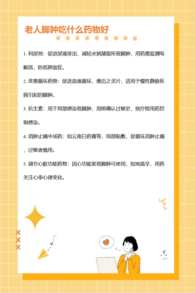老人脚肿可以选择利尿剂、改善循环药物、抗生素、消肿止痛中成药、调节心脏功能药物等好。一定要严格遵医嘱用药。