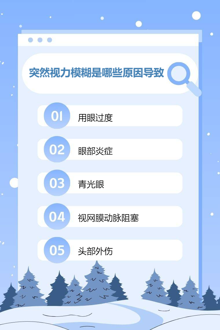 突然视力模糊可能由用眼过度、眼部炎症、青光眼、视网膜动脉阻塞、头部外伤等导致。