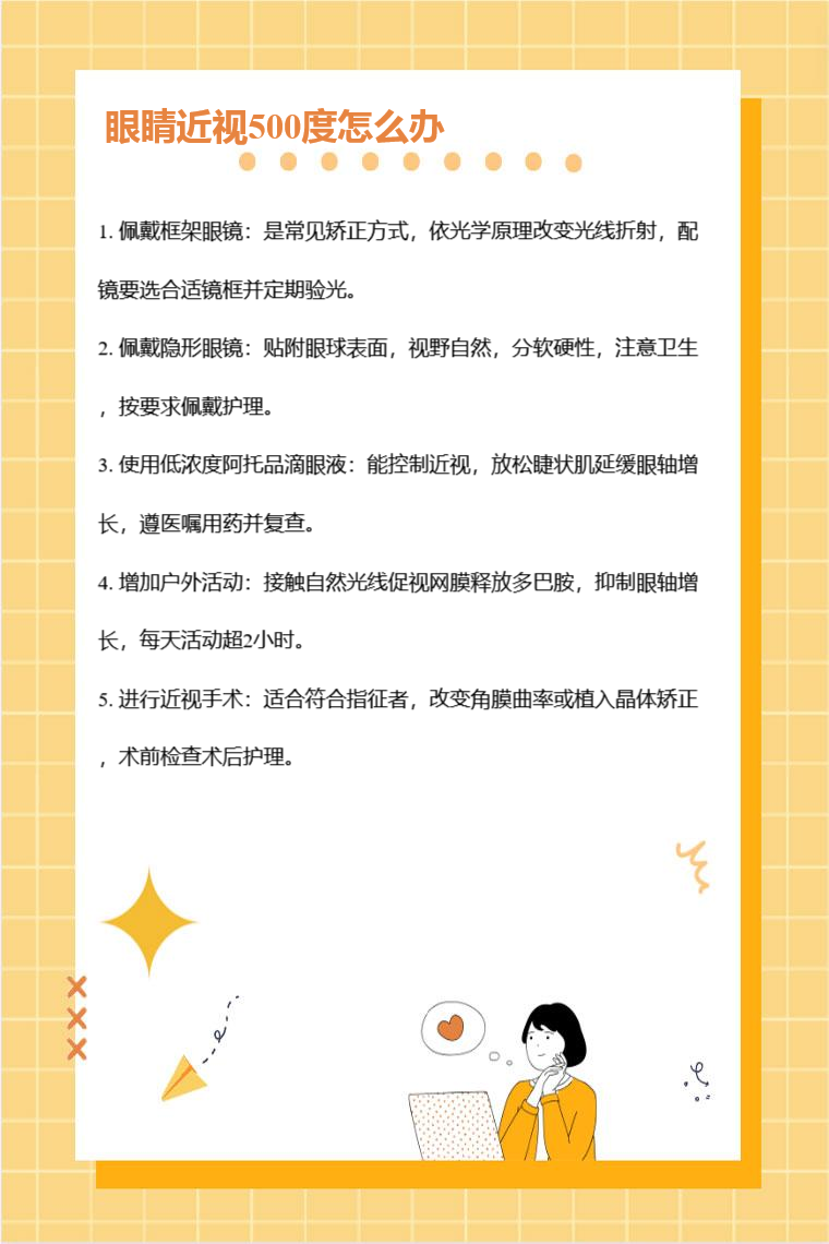 近视 500 度可通过佩戴框架眼镜、佩戴隐形眼镜、使用低浓度阿托品滴眼液、增加户外活动、进行近视手术等方法来应对。