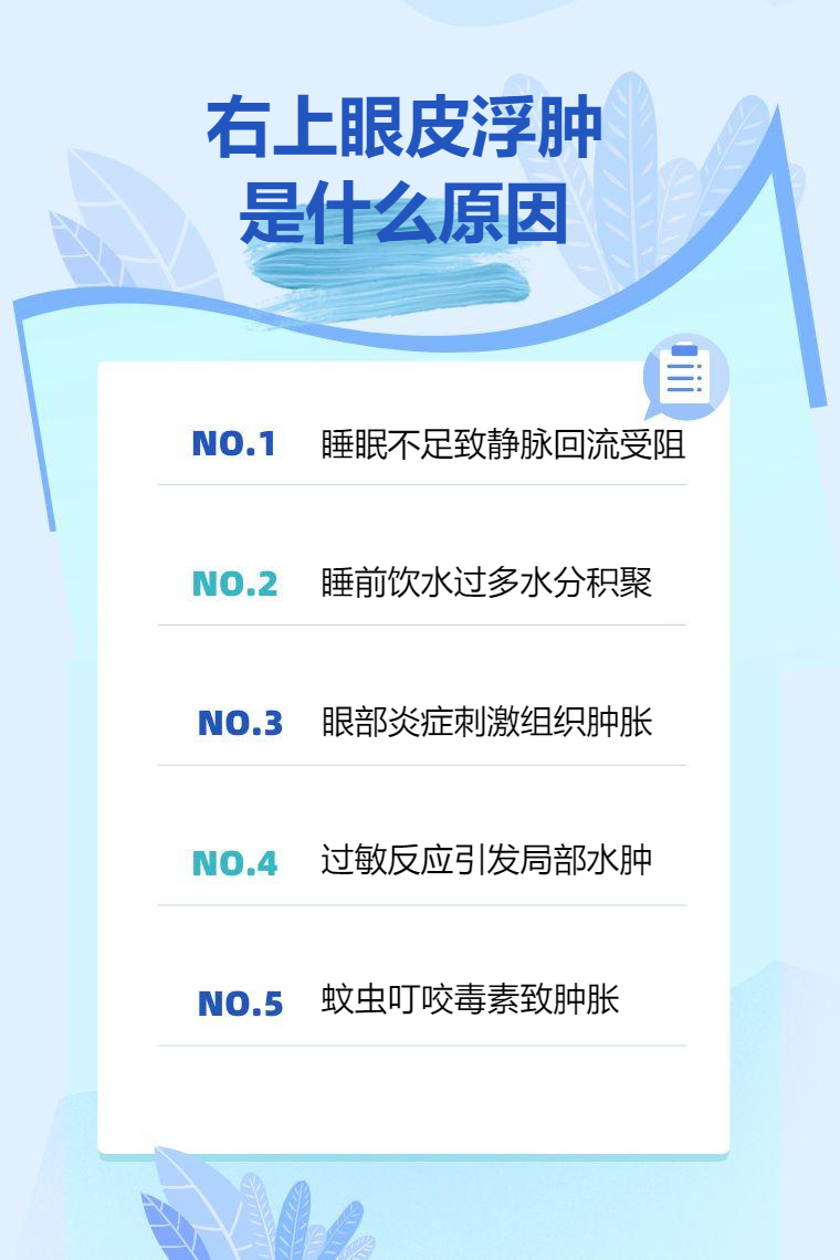 右上眼皮浮肿常见原因有睡眠不足、睡前饮水过多、眼部炎症、过敏反应、蚊虫叮咬等。