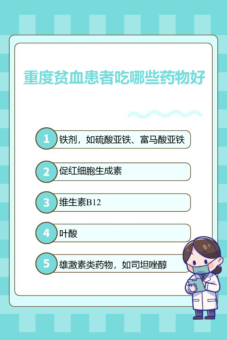 重度贫血患者吃铁剂、促红细胞生成素、维生素B12、叶酸、雄激素类药物比较好。遵医嘱用药是确保治疗效果和用药安全的关键。