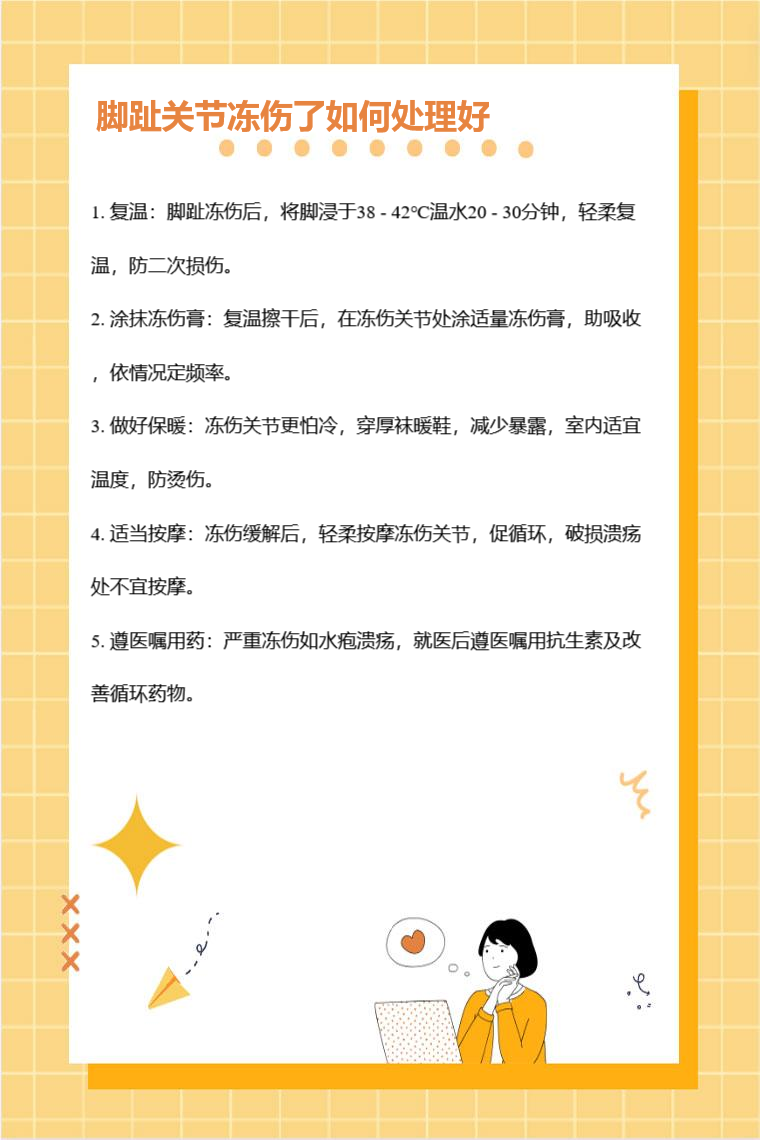 脚趾关节冻伤后可通过复温、涂抹冻伤膏、做好保暖、适当按摩、遵医嘱用药等处理好。