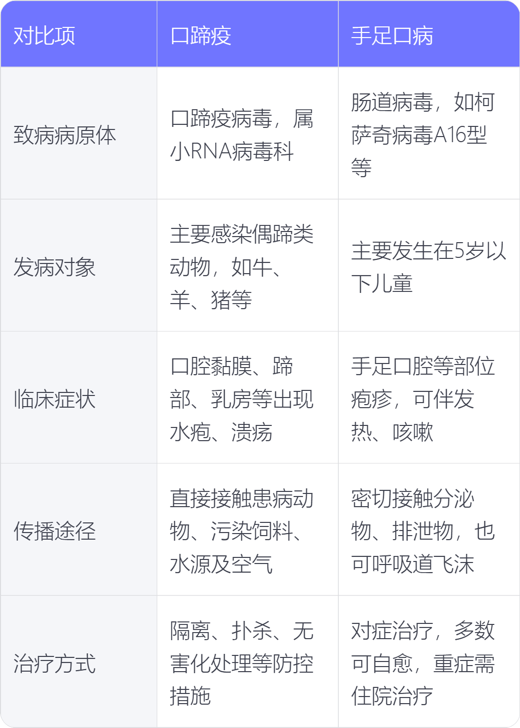 口蹄疫和手足口病在致病病原体、发病对象、临床症状、传播途径、治疗方式上存在不同。
