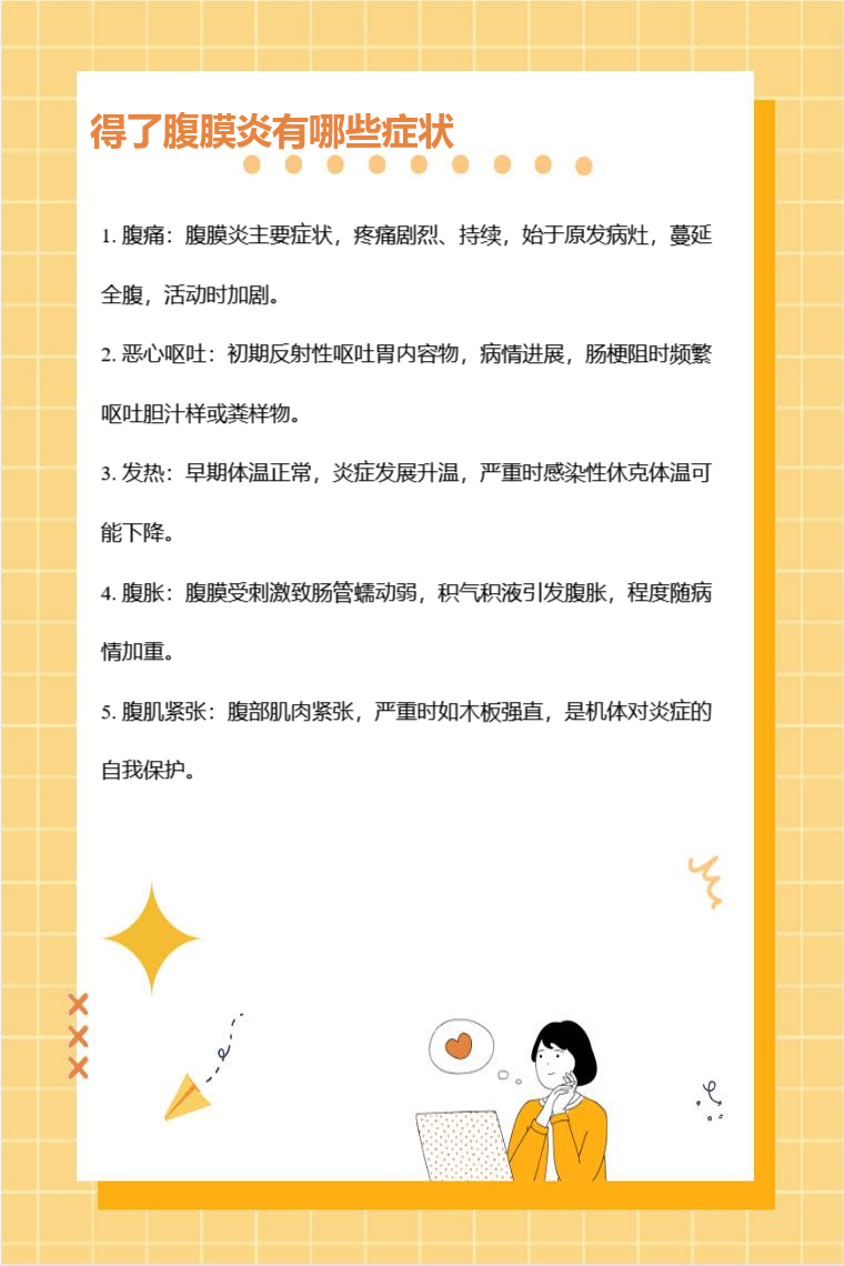 1. 腹痛:是腹膜炎最主要的症状,疼痛通常较为剧烈,呈持续性,难以忍受。疼痛部位多起始于原发病灶处,之后可蔓延至全腹,深呼吸、咳嗽或改变体位时疼痛会加剧。