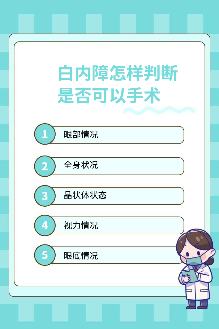 白内障判断是否可手术需综合眼部情况、全身状况、晶状体状态、视力情况、眼底情况等。