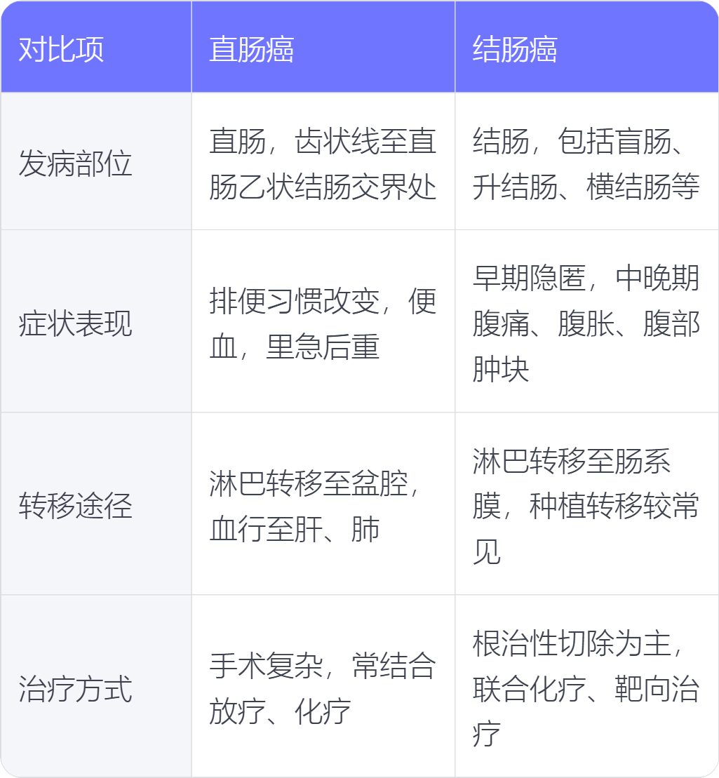 直肠癌和结肠癌在发病部位、症状表现、转移途径、治疗方式上存在不同。