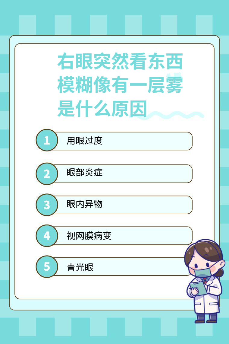 右眼突然看东西模糊像有一层雾可能是用眼过度、眼部炎症、眼内异物、视网膜病变、青光眼等情况。