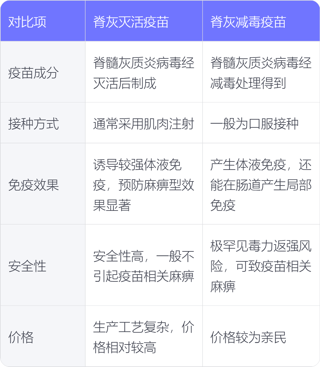 4. 安全性:脊灰灭活疫苗安全性较高,一般不会引起疫苗相关麻痹病例;脊灰减毒疫苗理论上存在极罕见的毒力返强风险,可能导致疫苗相关麻痹型脊髓灰质炎。