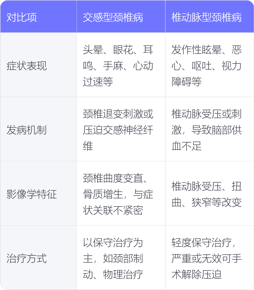 交感型和椎动脉型颈椎病可从症状表现、发病机制、影像学特征、治疗方式来区分。
