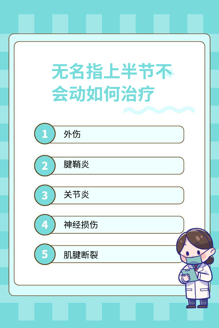 无名指上半节不会动可能是外伤、腱鞘炎、关节炎、神经损伤、肌腱断裂等因素,需要针对病因治疗,可采取的方法有手术、药物、康复训练等。