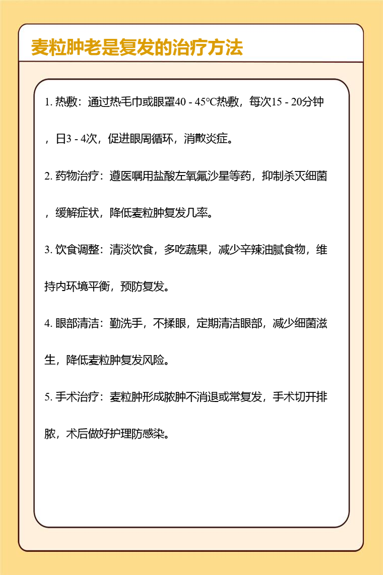 1. 热敷:热敷能促进眼部血液循环,对于老是复发的麦粒肿有积极作用。因血液循环加快后,可增强局部的新陈代谢,有助于炎症的消散和吸收,减轻麦粒肿引发的红肿疼痛等症状。用干净的热毛巾或热敷眼罩,温度控制在 40 - 45 摄氏度,每次热敷 15 - 20 分钟,每天 3 - 4 次。