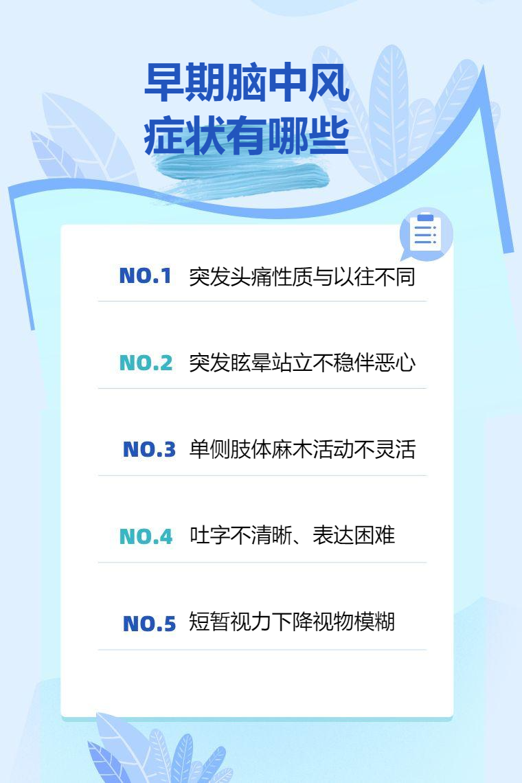 日常生活中要注意保持健康的生活方式,如均衡饮食、适量运动、戒烟限酒等,控制好血压、血糖、血脂等指标。定期进行体检,关注自身健康状况。一旦出现上述类似症状,应立即就医,以便尽早诊断和治疗,降低脑中风带来的危害 。