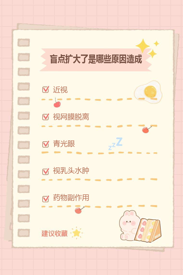 盲点扩大常见原因有近视、视网膜脱离、青光眼、视乳头水肿、药物副作用等。