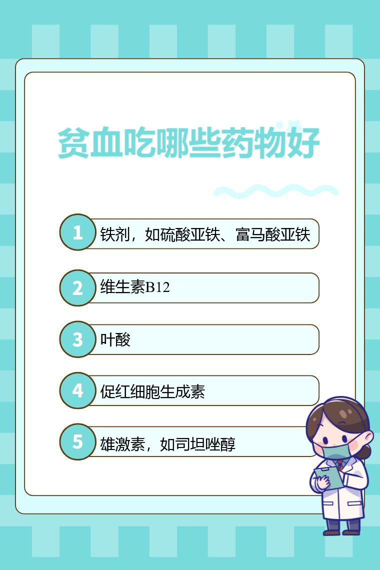 贫血患者吃铁剂、维生素B12、叶酸、促红细胞生成素、雄激素等药物好。贫血的治疗药物需在医生指导下使用,医生会根据贫血的类型、病因及患者具体情况合理选择用药。