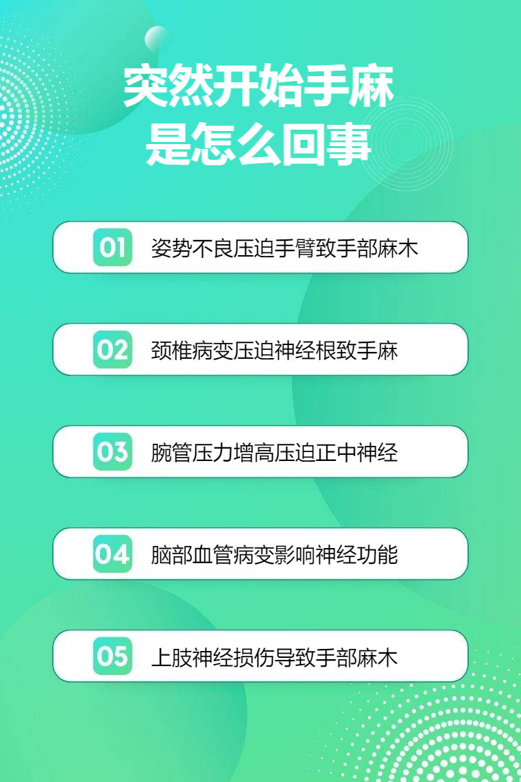 突然开始手麻可能由姿势不良、颈椎病、腕管综合征、脑部血管病变、上肢神经损伤等情况引起。