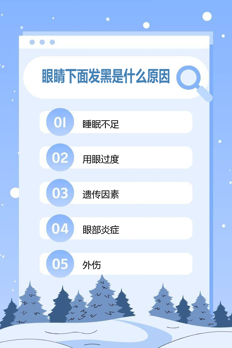 眼睛下面发黑常见原因有睡眠不足、用眼过度、遗传因素、眼部炎症、外伤等。