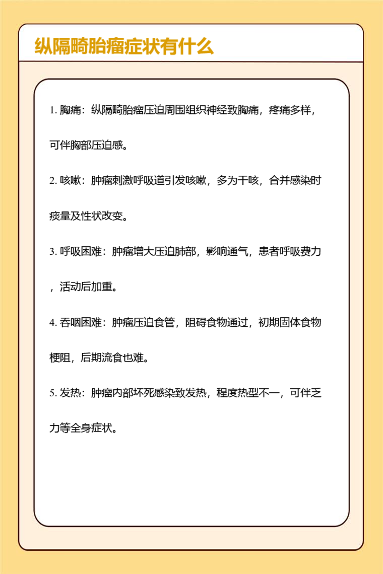 纵隔畸胎瘤症状有胸痛、咳嗽、呼吸困难、吞咽困难、发热等。