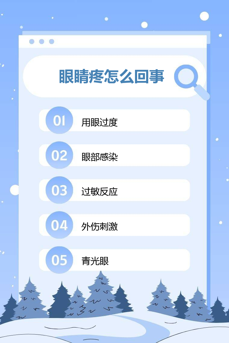 1. 用眼过度:长时间使用电子设备、阅读或熬夜等,易使眼睛疲劳疼痛。减少用眼时间,定时休息,多眺望远处,做眼保健操,也可用温热毛巾敷眼,促进血液循环缓解疲劳。