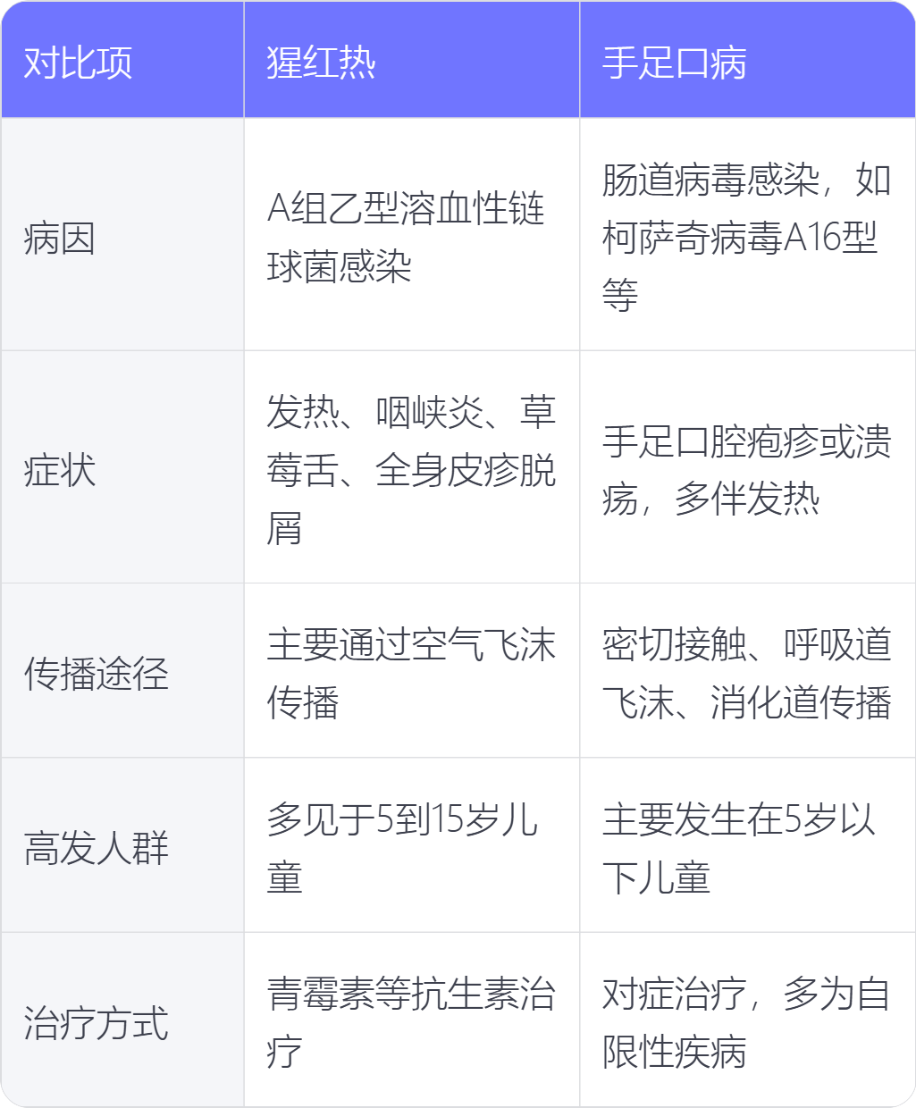 3. 传播途径:猩红热主要通过空气飞沫传播,也可通过皮肤伤口或产道等接触传播;手足口病主要通过密切接触传播,如接触被病毒污染的手、毛巾、玩具等,也可通过呼吸道飞沫传播,饮用或食入被病毒污染的水、食物等也可感染。