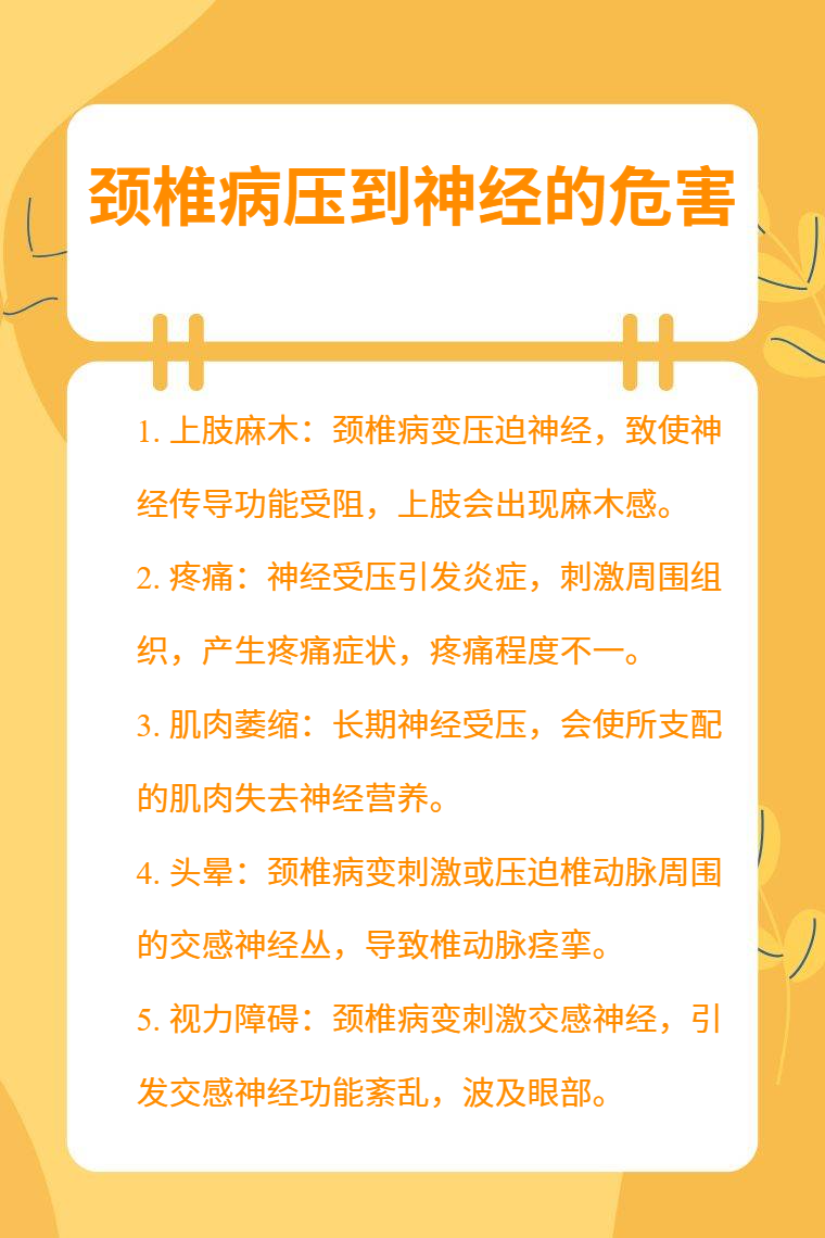 颈椎病压迫神经可导致上肢麻木、疼痛、肌肉萎缩、头晕、视力障碍等。