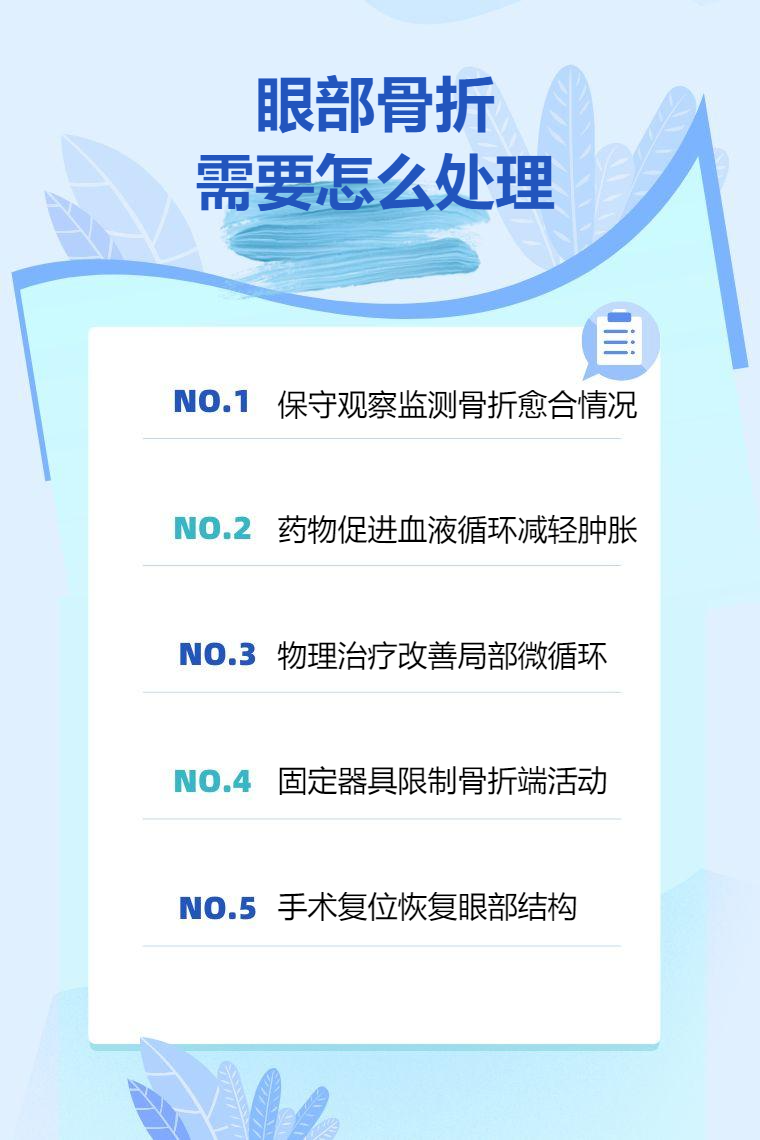 眼部骨折的处理方法通常有保守观察、药物治疗、物理治疗、眼部固定、手术治疗等。