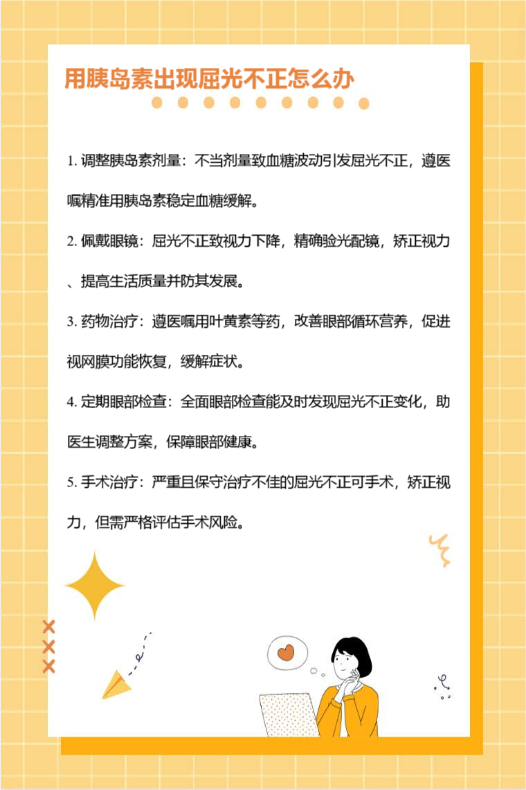用胰岛素出现屈光不正可通过调整胰岛素剂量、佩戴眼镜、药物治疗、定期眼部检查、手术治疗等方法来应对。