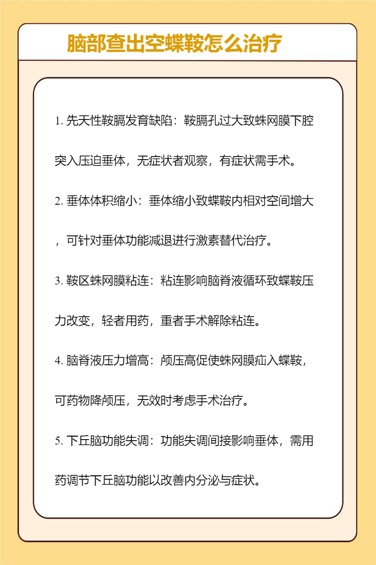脑部查出空蝶鞍可能是先天性鞍膈发育缺陷、垂体体积缩小、鞍区蛛网膜粘连、脑脊液压力增高、下丘脑功能失调等因素,需要针对病因治疗,可采取的方法有药物治疗、手术治疗等。