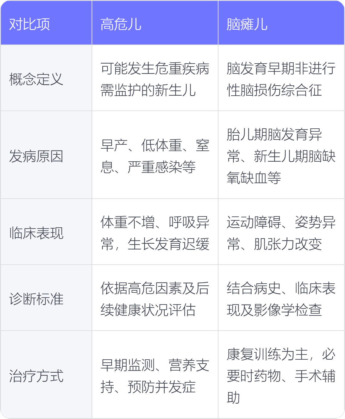 高危儿和脑瘫儿在概念定义、发病原因、临床表现、诊断标准、治疗方式上存在不同。