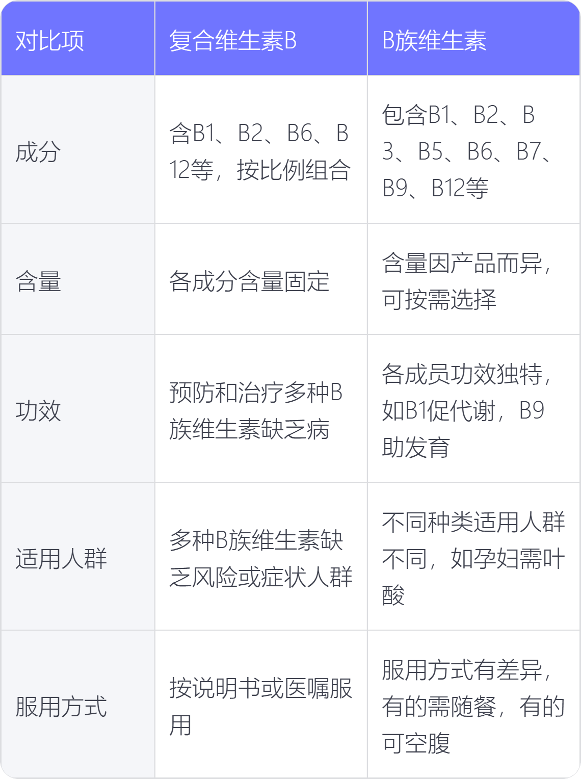 1. 成分:复合维生素B通常含有多种B族维生素,如维生素B1、B2、B6、B12等,是几种B族维生素按照一定比例组合而成;B族维生素是一个大家族,包含了维生素B1、B2、B3烟酸、B5泛酸、B6、B7生物素、B9叶酸、B12等多种维生素,范围更广。