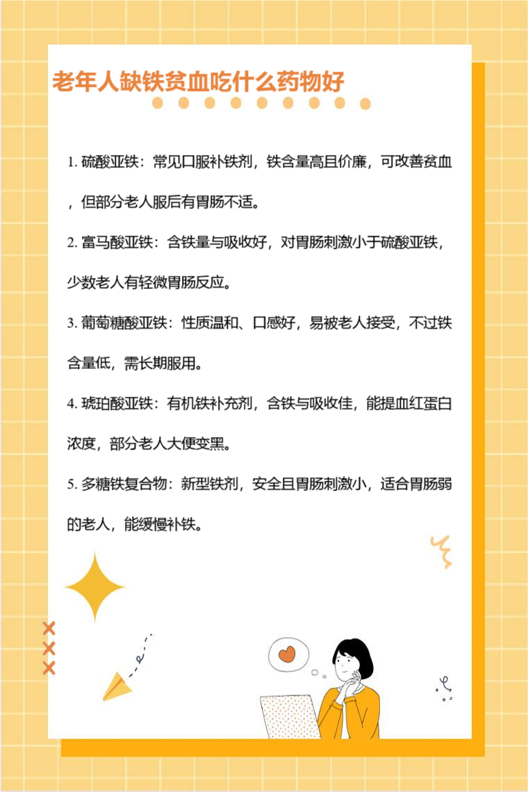 4. 琥珀酸亚铁:是一种有机铁补充剂,含铁量高,吸收良好,能有效提高血红蛋白浓度。不良反应相对较少,部分老年人可能会出现大便颜色变黑的情况,这属于正常现象,不必过于担心。
