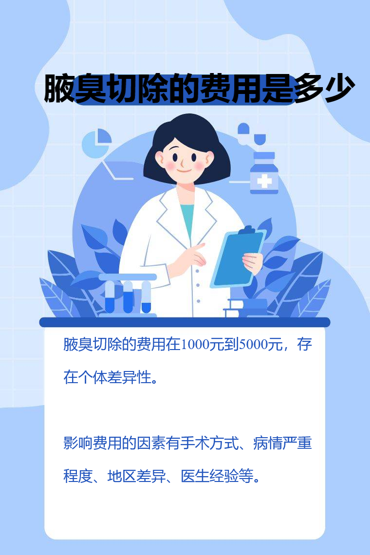 腋臭切除的费用在1000元到5000元,存在个体差异性。影响费用的因素有手术方式、病情严重程度、地区差异、医生经验等。