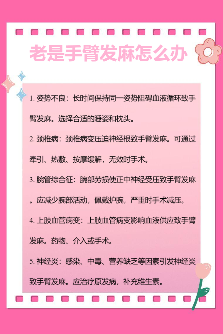 老是手臂发麻可能是姿势不良、颈椎病、腕管综合征、上肢血管病变、神经炎等因素,需要针对病因治疗,可采取的方法有调整姿势、物理治疗、手术治疗、药物治疗等。