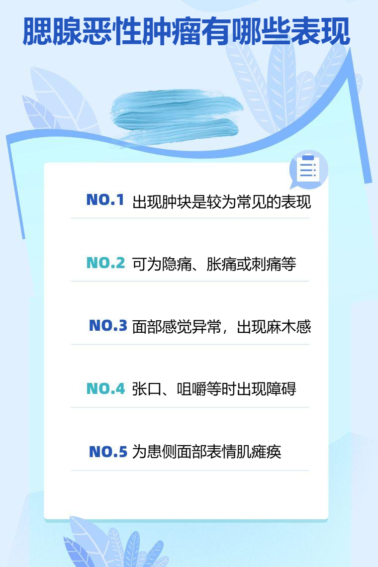 腮腺恶性肿瘤的表现有肿块、疼痛、面部麻木、开口受限、面瘫等。