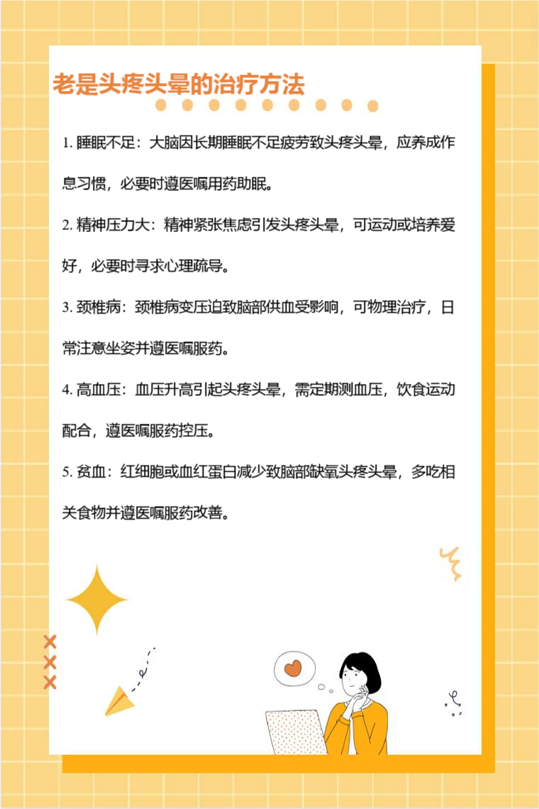 老是头疼头晕可能是睡眠不足、精神压力大、颈椎病、高血压、贫血等因素,需要针对病因治疗,可采取的方法有改善睡眠、调节情绪、物理治疗、药物治疗、饮食调理等。