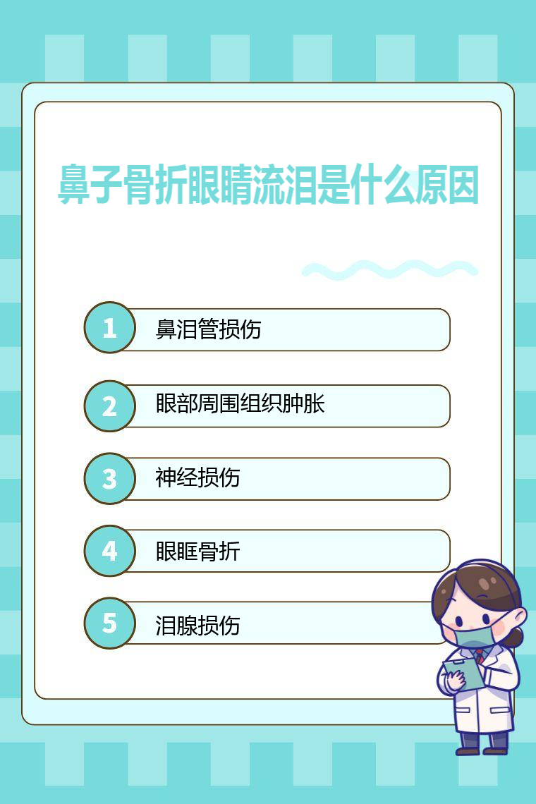 鼻子骨折眼睛流泪的原因常见的有鼻泪管损伤、眼部周围组织肿胀、神经损伤、眼眶骨折、泪腺损伤等。