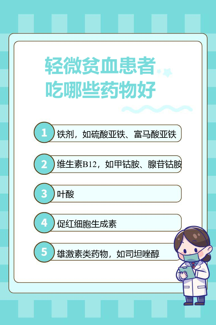 轻微贫血患者吃铁剂、维生素B12、叶酸、促红细胞生成素、雄激素类药物好。遵医嘱用药是确保治疗效果和用药安全的关键,这些药物从常见到罕见排序依次发挥着不同作用,帮助改善轻微贫血状况。