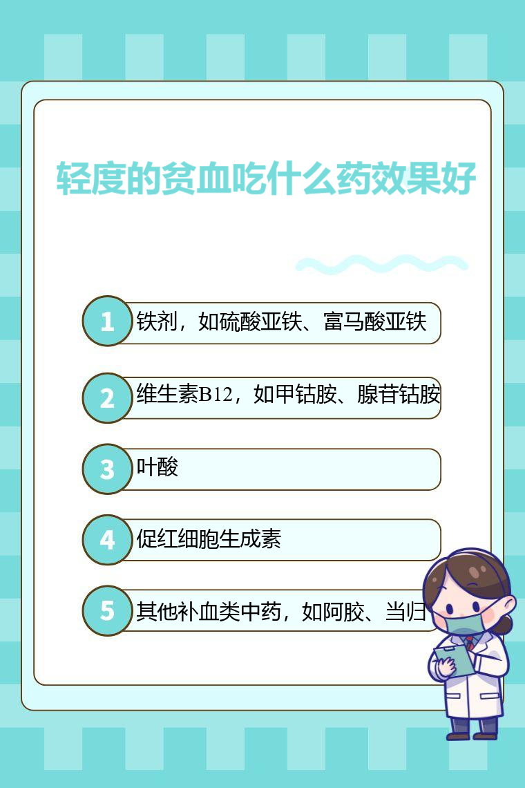 轻度贫血患者一般吃铁剂、维生素B12、叶酸、促红细胞生成素、其他补血类中药等效果好。在用药时一定要严格遵医嘱,不可自行随意增减药量或停药。