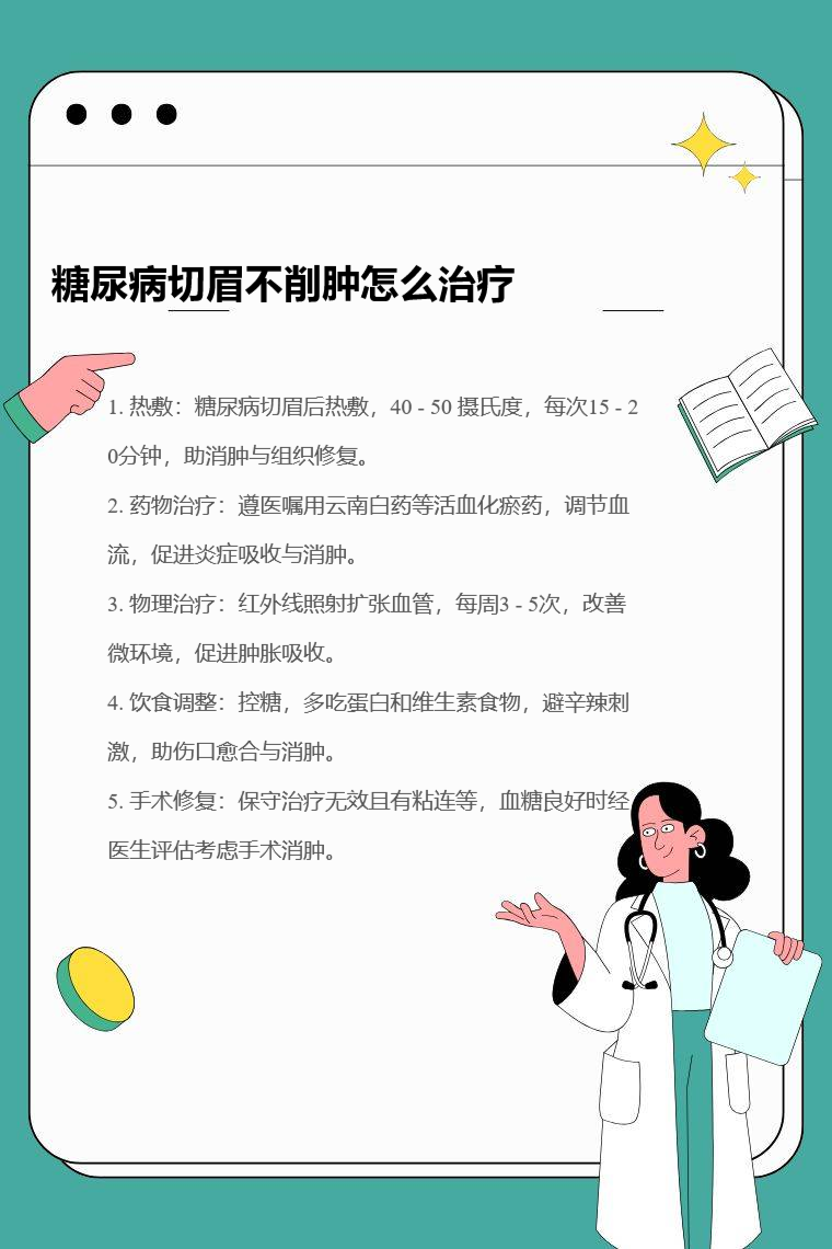糖尿病切眉后不消肿可通过热敷、药物治疗、物理治疗、饮食调整、手术修复等方法来处理。