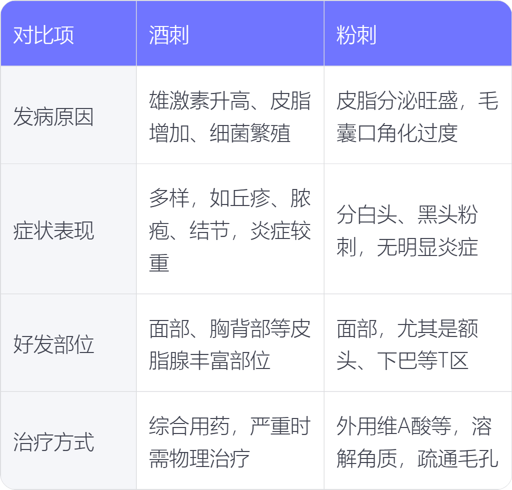 酒刺和粉刺在发病原因、症状表现、好发部位、治疗方式上存在不同。