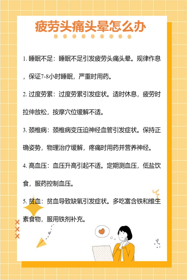 疲劳头痛头晕可能是睡眠不足、过度劳累、颈椎病、高血压、贫血等因素,需要针对病因治疗,可采取的方法有改善睡眠、注意休息、物理治疗、药物治疗、饮食调理等。