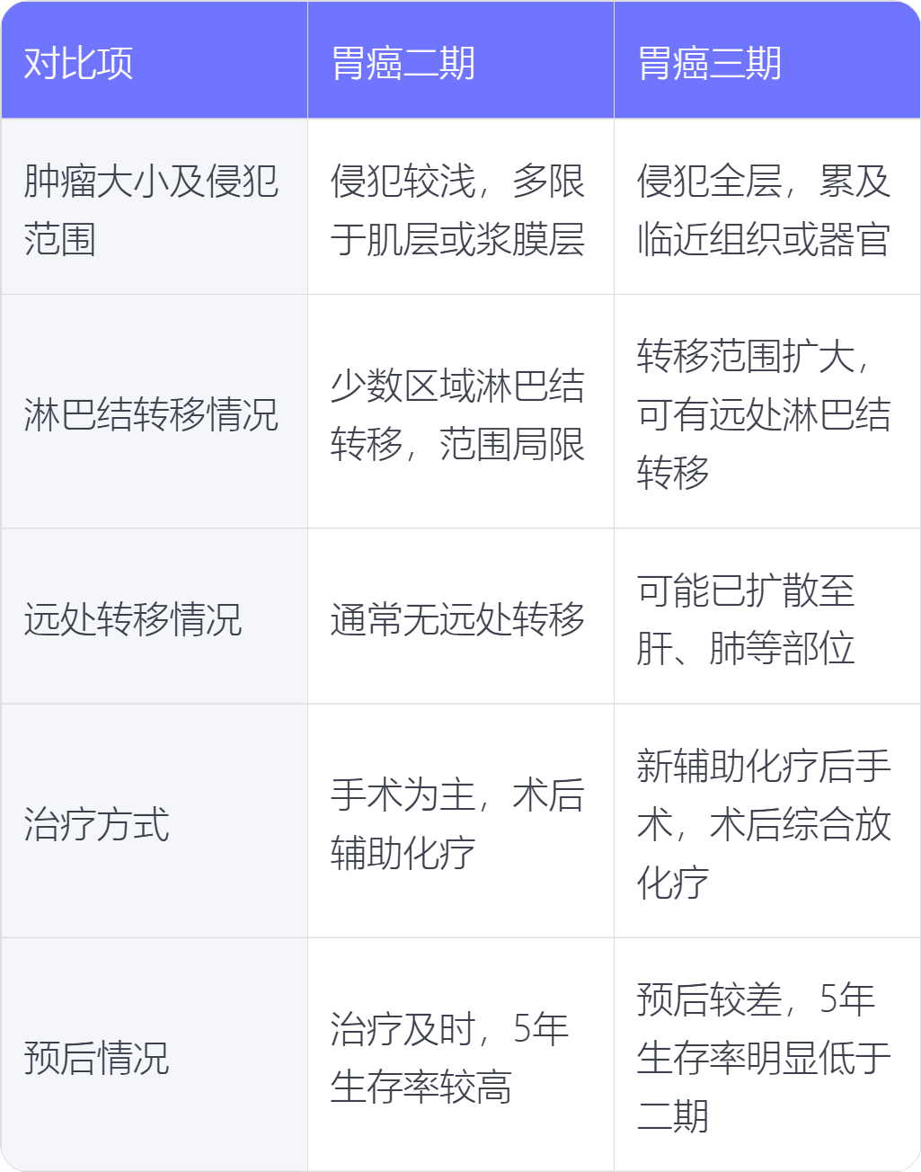 胃癌二期与三期在肿瘤大小及侵犯范围、淋巴结转移情况、远处转移情况、治疗方式、预后情况上存在不同。