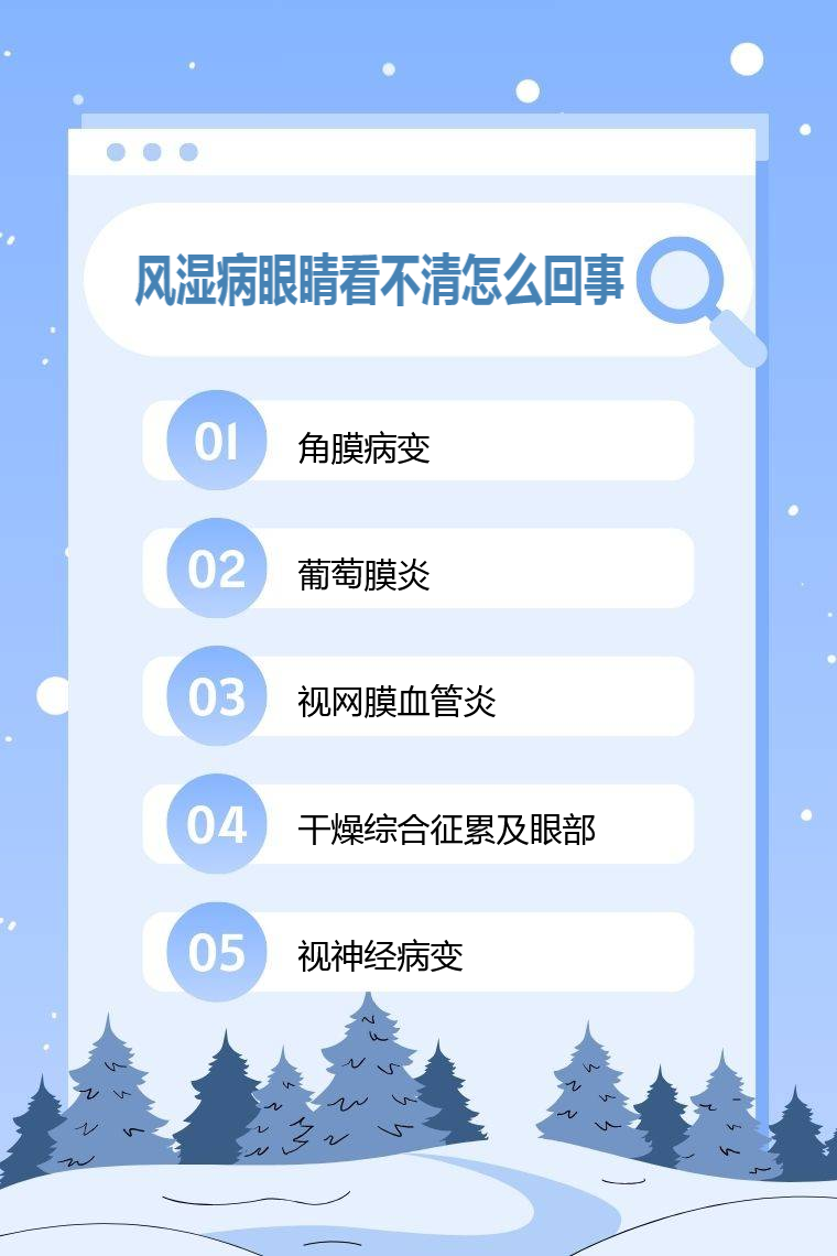 风湿病眼睛看不清可能是由于角膜病变、葡萄膜炎、视网膜血管炎、干燥综合征累及眼部、视神经病变等。