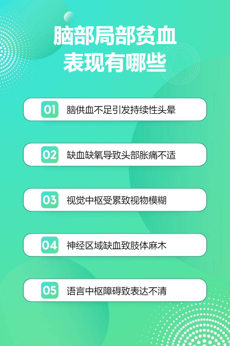 脑部局部贫血表现有头晕、头痛、视力模糊、肢体麻木、言语不清等。
