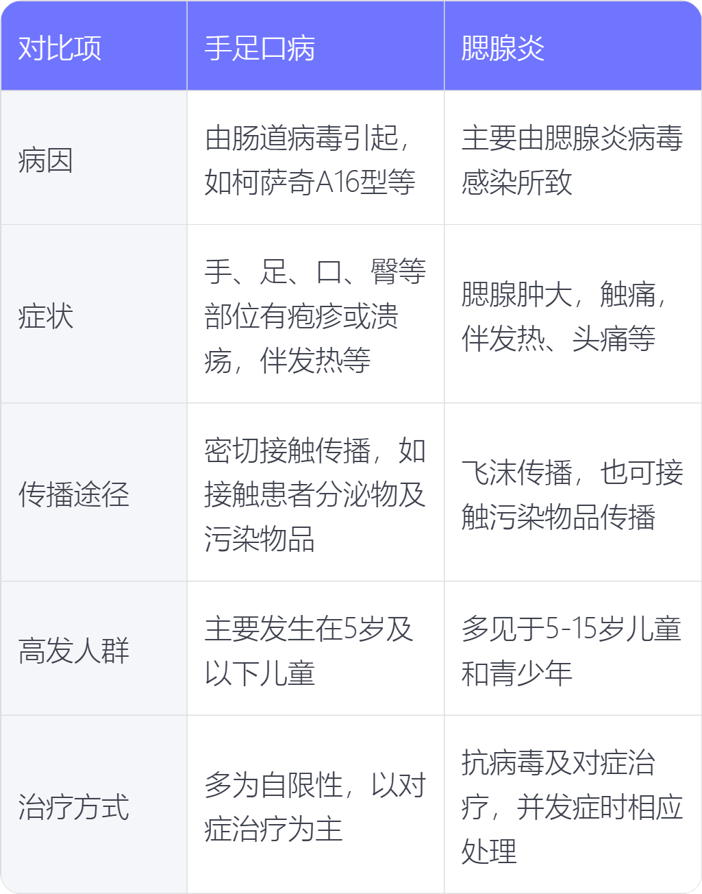 手足口病和腮腺炎在病因、症状、传播途径、高发人群、治疗方式上存在不同。