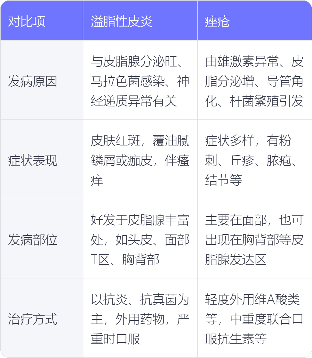溢脂性皮炎和痤疮在发病原因、症状表现、发病部位、治疗方式上存在不同。