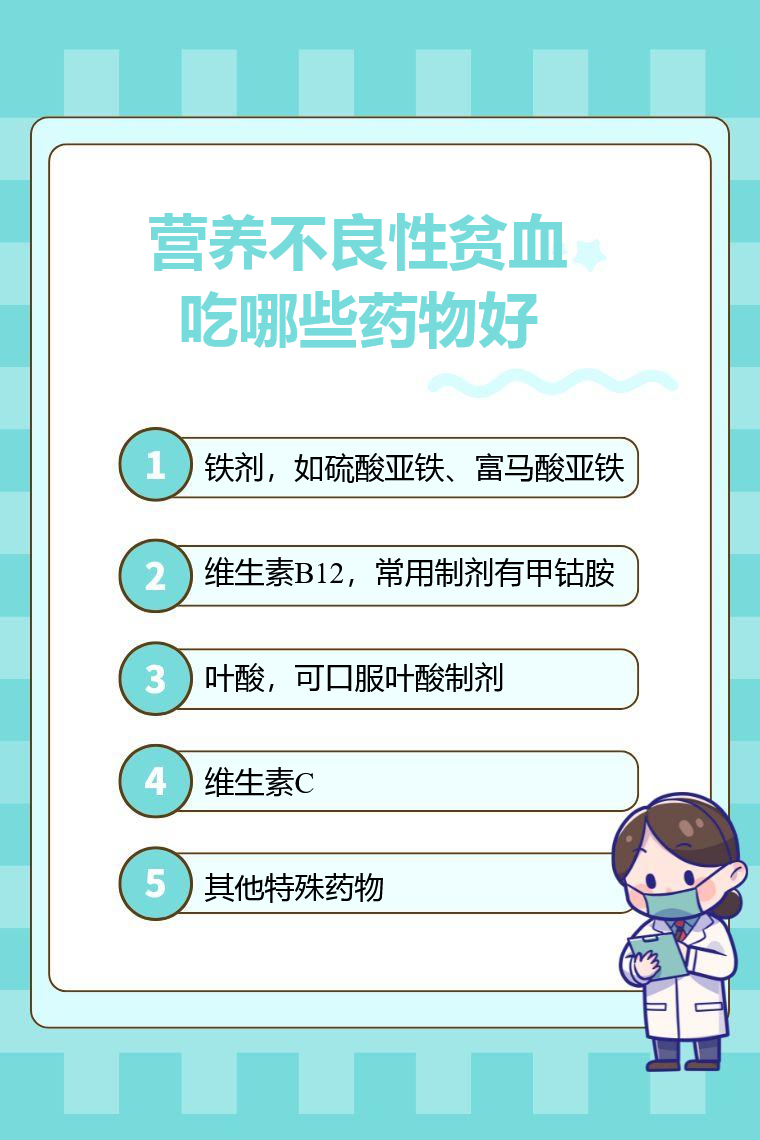 营养不良性贫血吃铁剂、维生素B12、叶酸、维生素C、其他特殊药物好。出现营养不良性贫血要严格遵医嘱用药,不可自行增减剂量或停药。