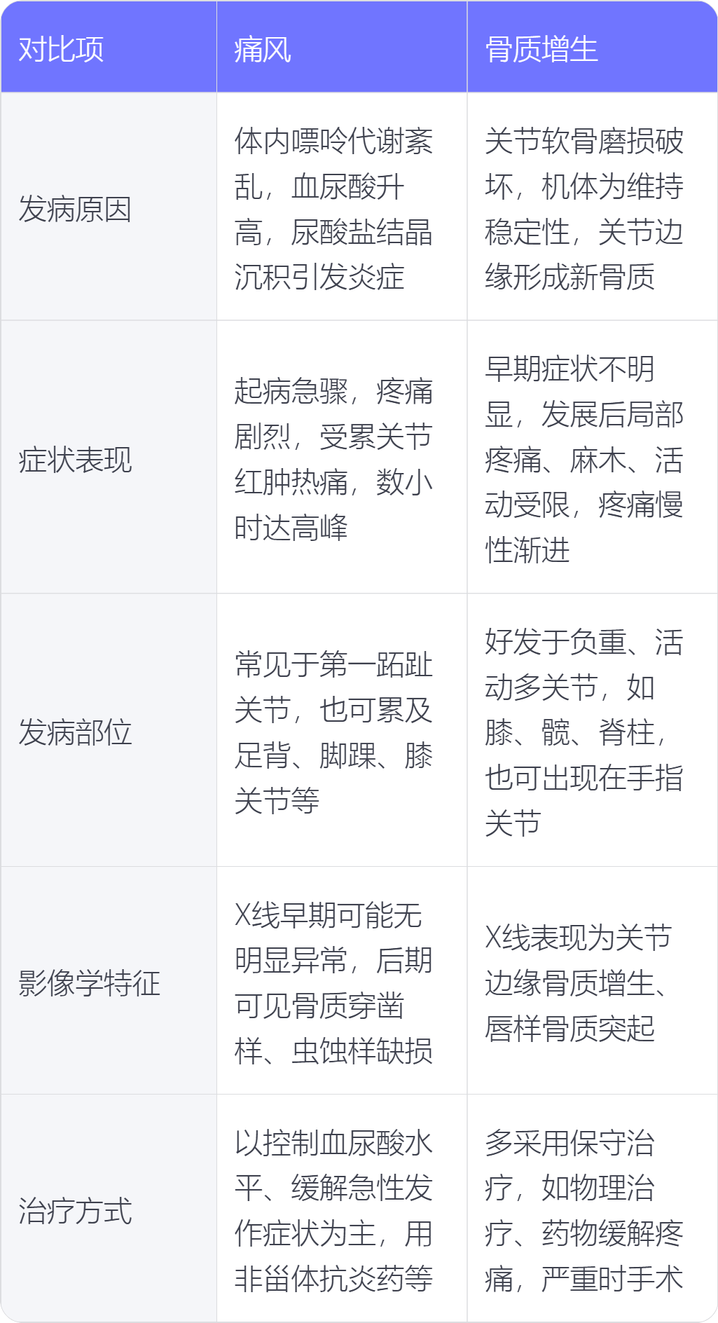 痛风和骨质增生可从发病原因、症状表现、发病部位、影像学特征、治疗方式来区分。